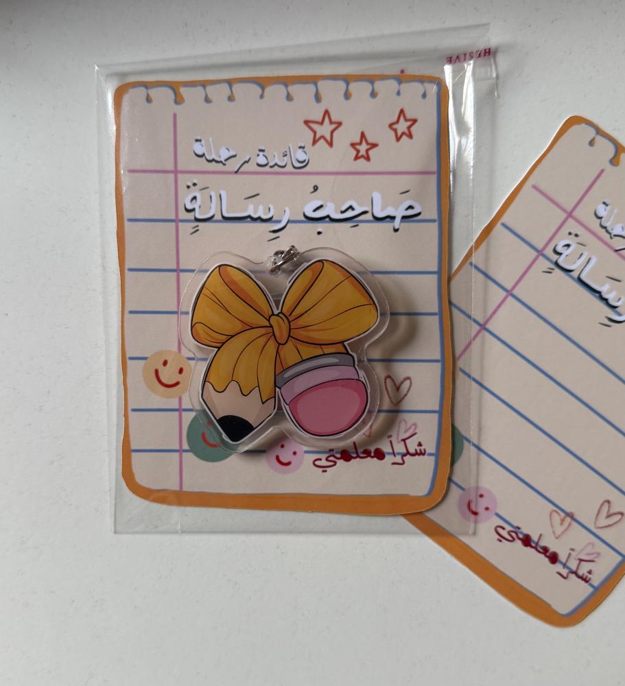 ميدالية أنيقة على شكل قلم مزين بفيونكة جميلة، صُممت خصيصًا لتكون هدية مميزة للمعلمات. تجمع بين البساطة والجمال، وتعبر عن الامتنان والتقدير لدور المعلمة العظيم. مناسبة للاستخدام اليومي كميدالية مفاتيح أو إكسسوار للحقيبة، وتُعد اختيارًا مثاليًا كهدية في يوم المعلم أو أي مناسبة خاصة.