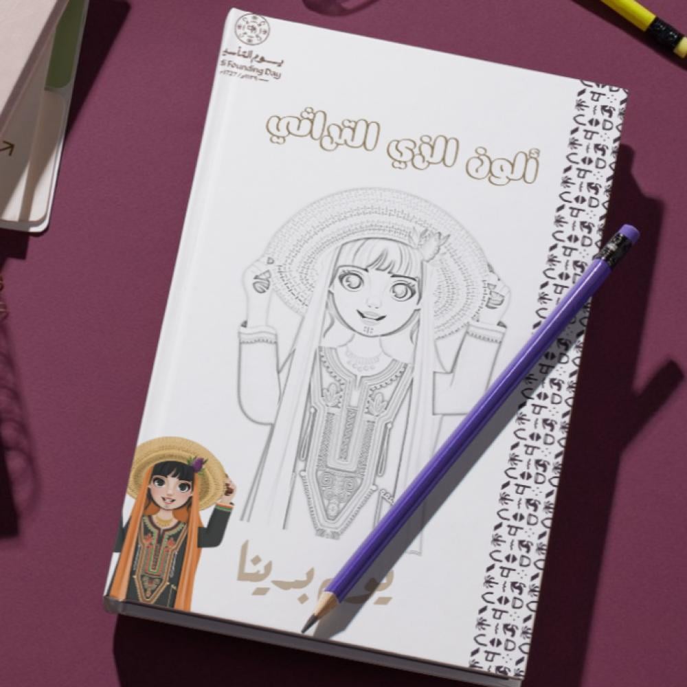 ملف يحتوي على بطاقه تلوين للأطفال بصوره بنت بالزي العسيري ليوم التأسيس